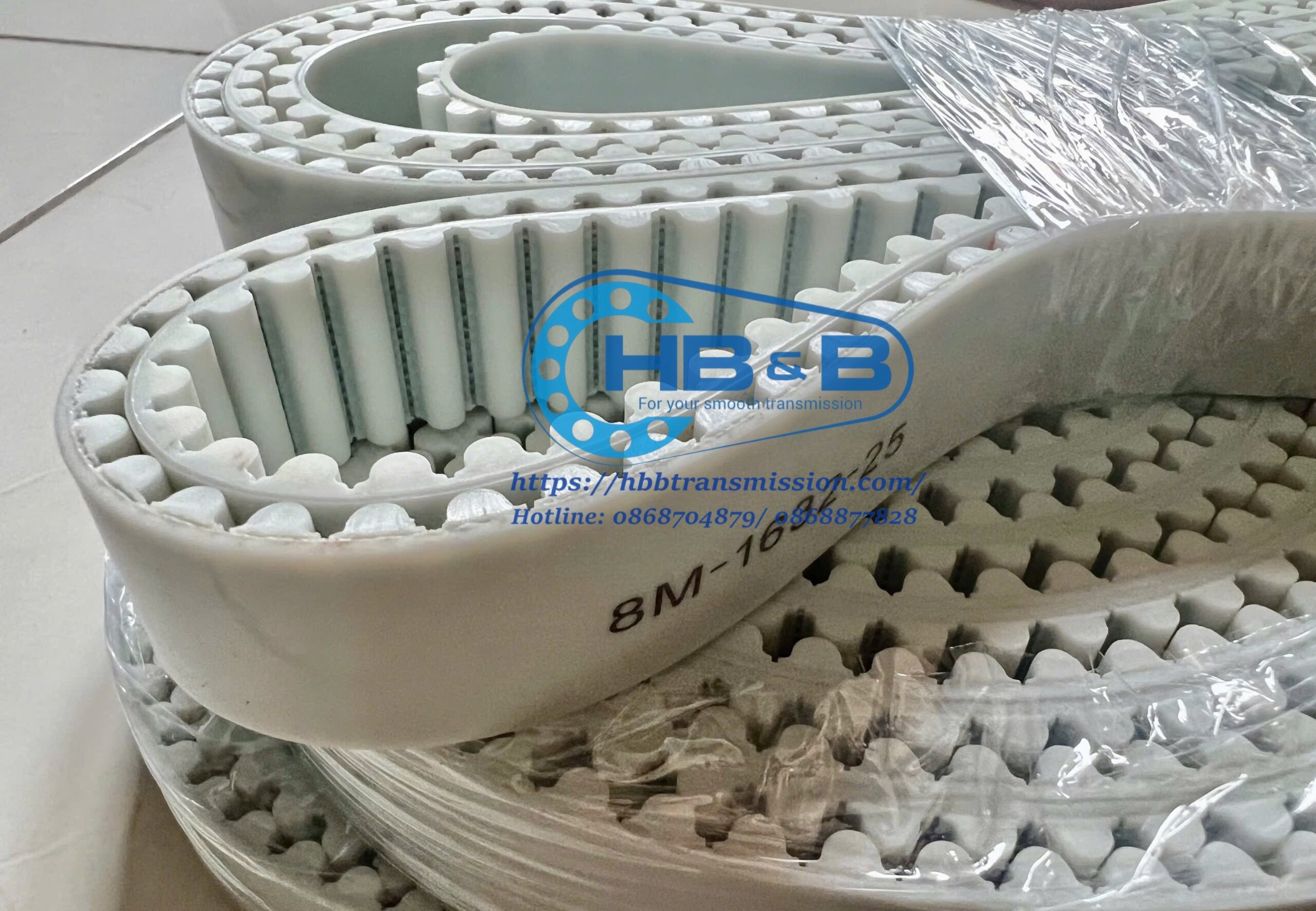 Dây curoa PU trắng lõi thép 8M-1632-25, nối tròn là dây curoa gia công ép nhiệt , nối tròn theo kích thước yêu cầu